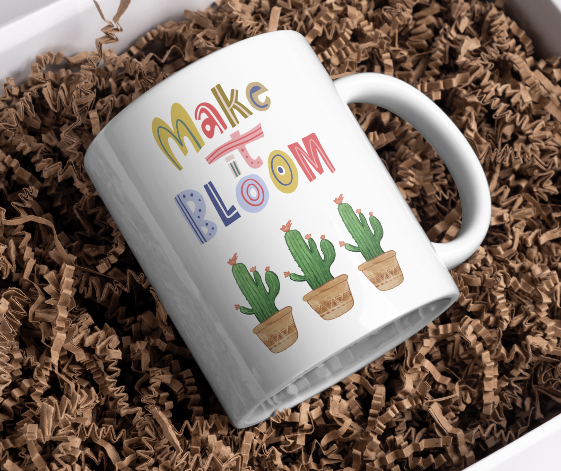 Spread joy with every sip! This charming quotation mug features the uplifting message "Make It Bloom," reminding you to nurture growth and positivity in your daily life. Perfect for coffee lovers, tea enthusiasts, or anyone who needs a little inspiration with their morning brew. The playful design makes it an ideal gift for friends, family, or yourself. Durable ceramic construction ensures lasting quality, while the vibrant print brings a smile to your face day after day.