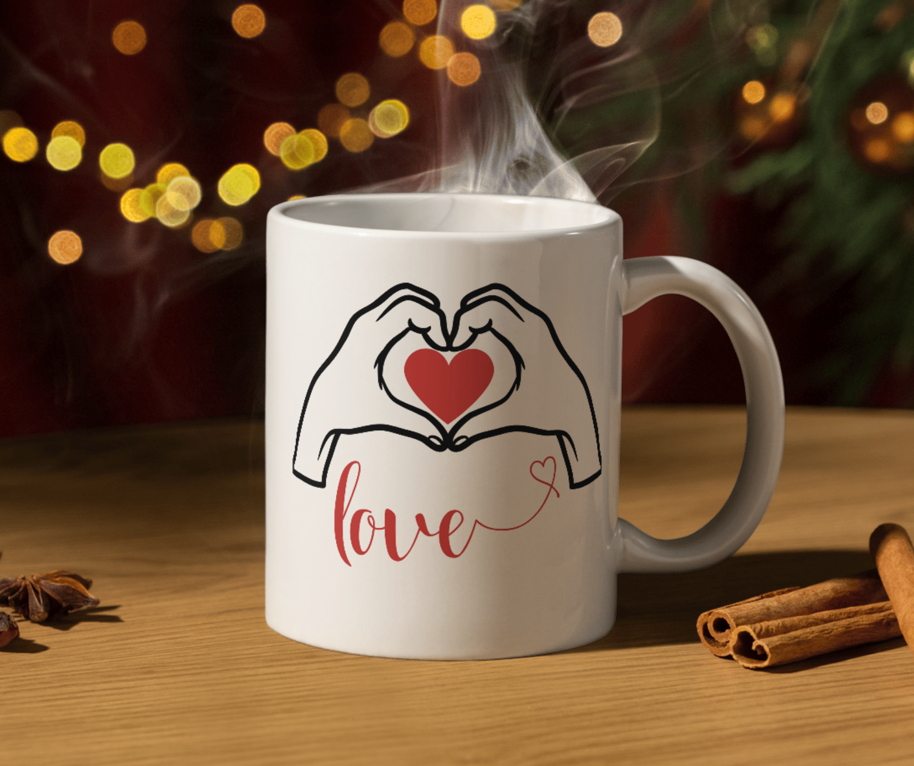 Spread the love with every sip! This charming mug features hands forming a heart sign with the word "love" emblazoned across it. Perfect for coffee lovers, tea enthusiasts, or anyone who wants to share a little warmth and affection. Whether you're gifting it to someone special or treating yourself, this playful design brings a smile to your morning routine. A heartfelt way to start your day.