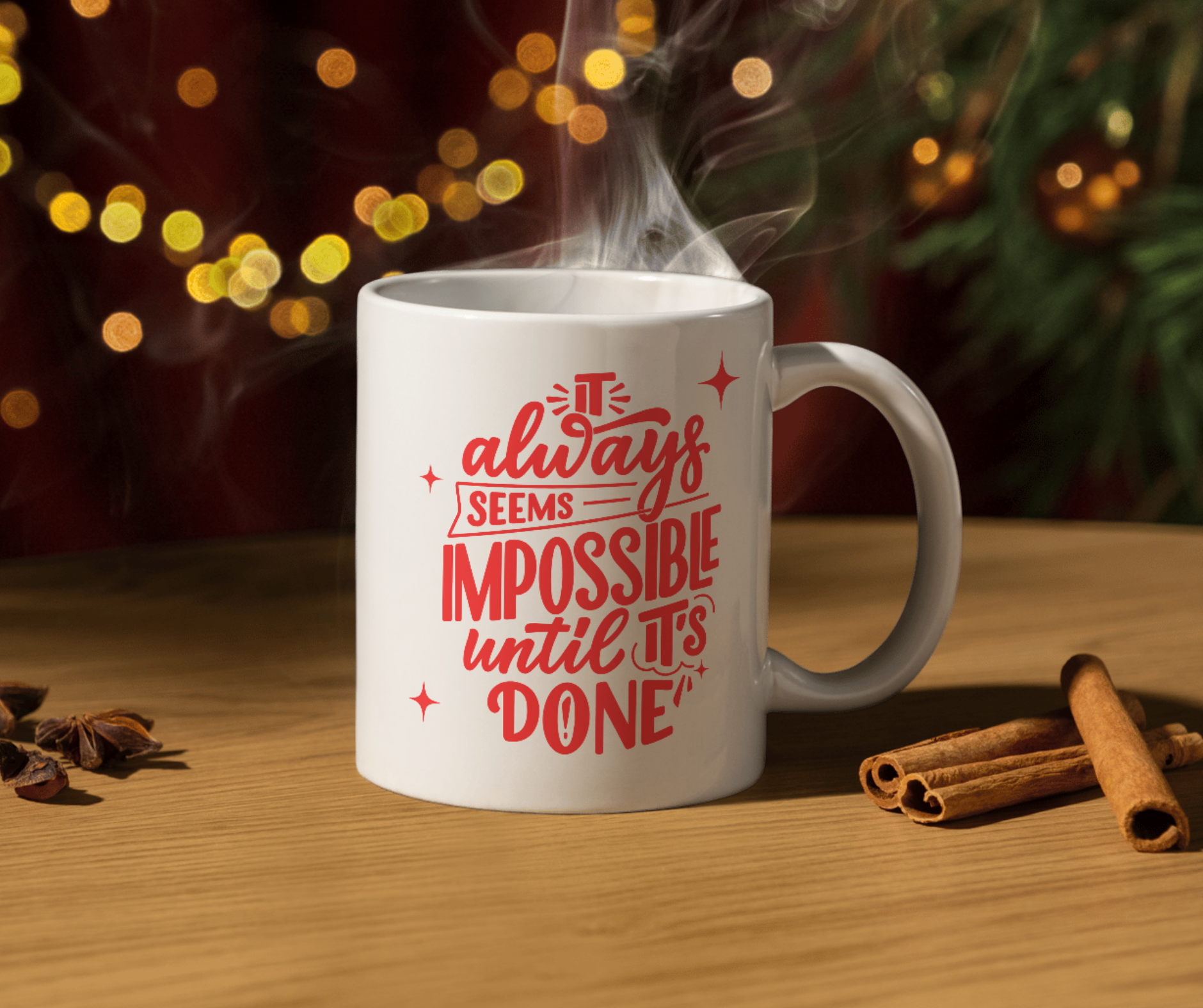 Sip your daily dose of motivation with this charming quotation mug featuring the timeless wisdom: "It always seems impossible until it's done." Perfect for coffee lovers, dreamers, and anyone who needs a gentle reminder that great things start with a single step. The playful design makes it an ideal gift for friends chasing their goals or a treat-yourself pick-me-up. Durable ceramic construction keeps your beverages at the perfect temperature while you tackle your to-do list. Start your morning inspired!