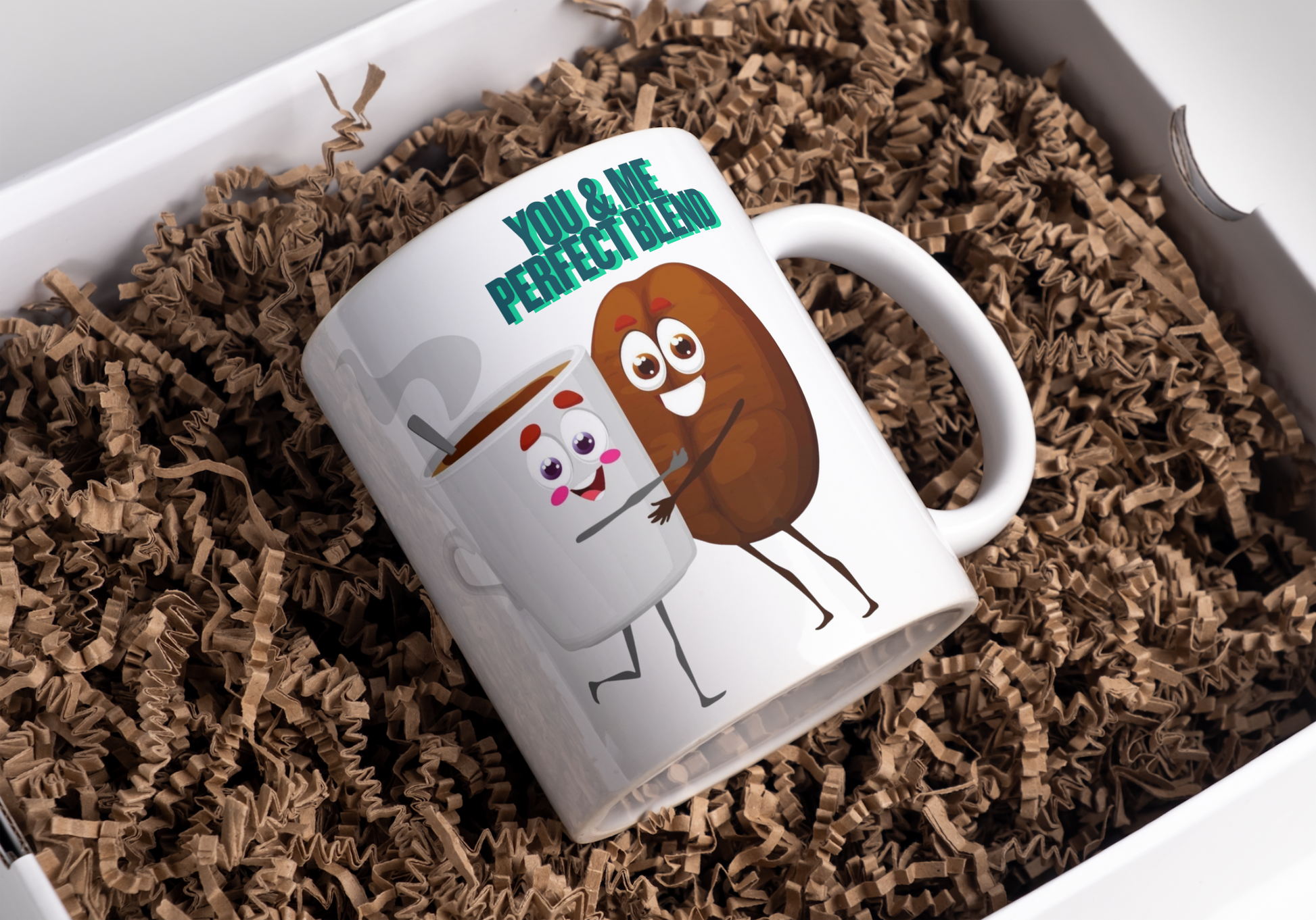 Celebrate your perfect match with this charming mug featuring an adorable coffee mug and coffee bean sharing a cozy hug. The playful "You and Me" design paired with "Perfect Blend" captures that special connection—whether it's between you and your morning coffee ritual or you and someone special. Ideal for coffee lovers with a sense of humour, this delightful mug brings a smile to every sip. A thoughtful gift for anyone who appreciates the lighter side of caffeine culture.